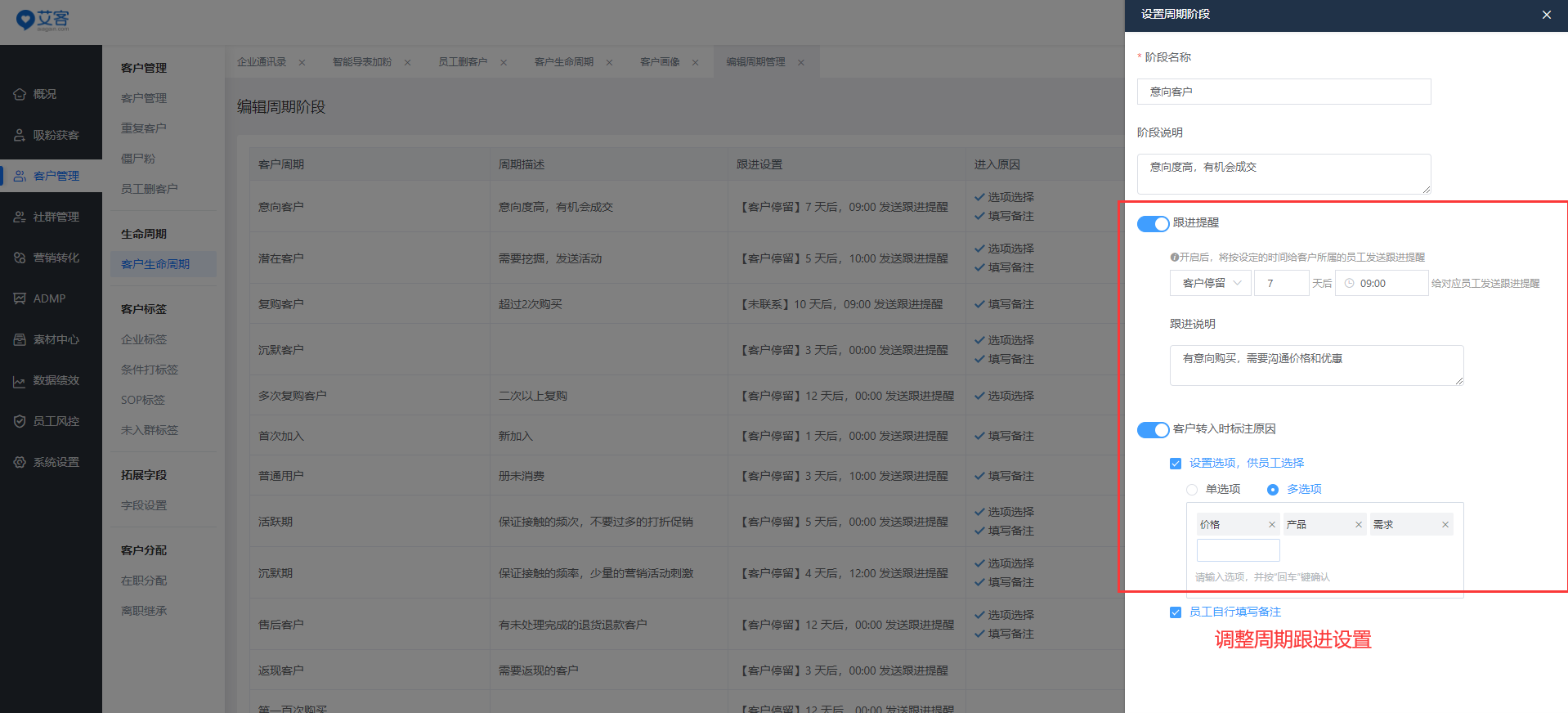 可以对在阶段内停留一定时间的客户的员工,发送需进行跟进的提醒。