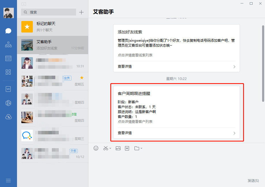 给客户设置一个完整的客户生命周期,它可以描述客户从加企业微信到流失所处的各个发展阶段,设置完成后,系统会对企业员工发送跟进提醒。