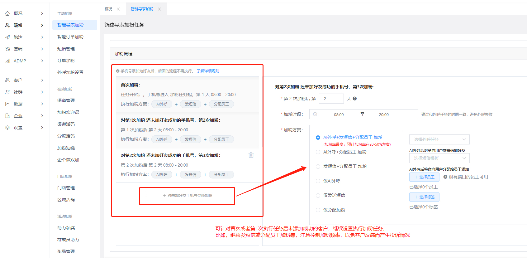 在使用此功能加粉过程中,企业还可以设置加粉SOP流程,当导入手机号第一次执行加粉失败后,间隔一段时间系统自动执行第二次加粉操作。这种流程化的加粉方式,可以提升加粉的成功率。