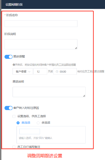 转入原因:设置后,员工将客户添加至该阶段,需选择或填写转入原因。