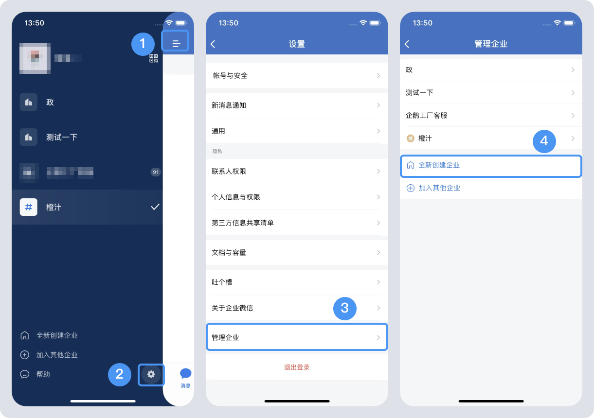 B.消息页面->左上角三横->右下角设置->管理企业->全新创建企业