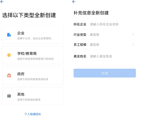 在手机端创建企业页面底部,我们还能看见“个人组建团队”入口,点击后补充团队名称和注册人姓名就能注册成功。