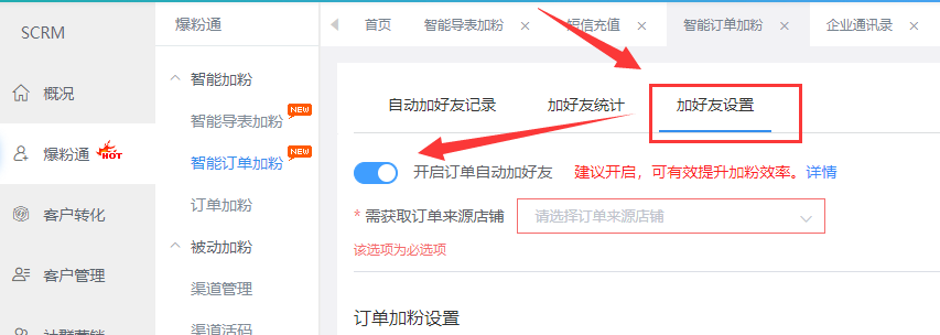 a、进入【爆粉通】-【智能订单加粉】-【加好友设置】-开启订单自动加好友
