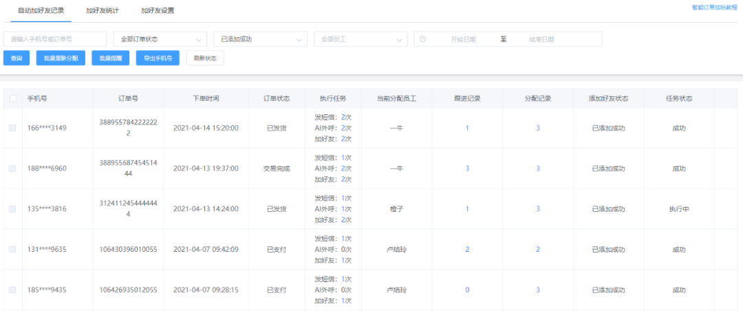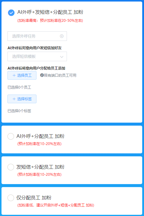 - AI外呼+发短信+分配员工加粉:是指有新的订单收货手机号时,会导入手机号进行AI智能外呼,用户接电话并确定有加好友意向时,接着会给有意向的手机号发送商家指定的短信内容,通过双重触达后再分配给选中的员工,员工会收到实时提醒,要求员工实时去添加当前这个手机号为好友.