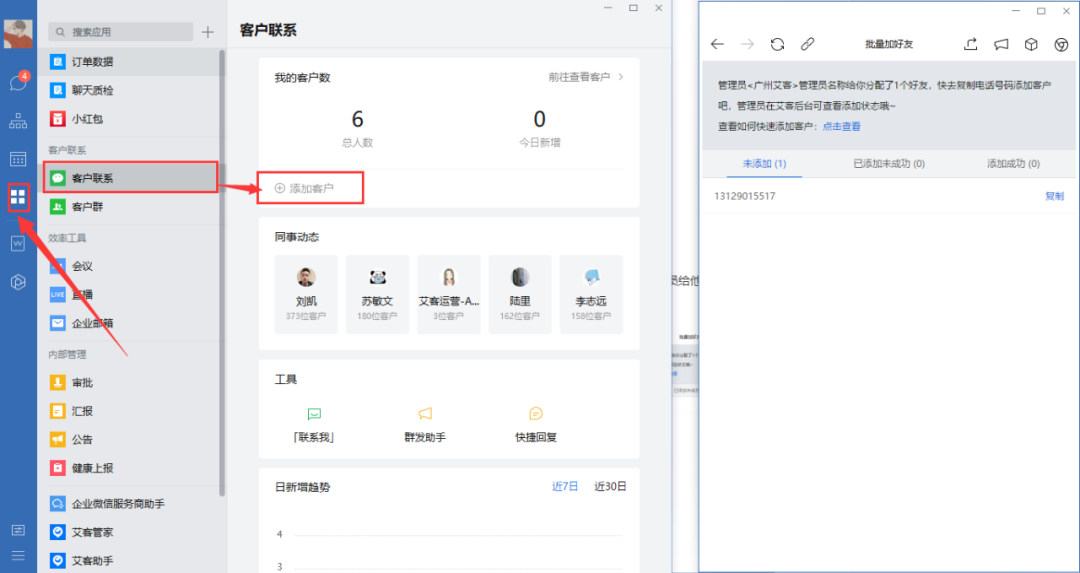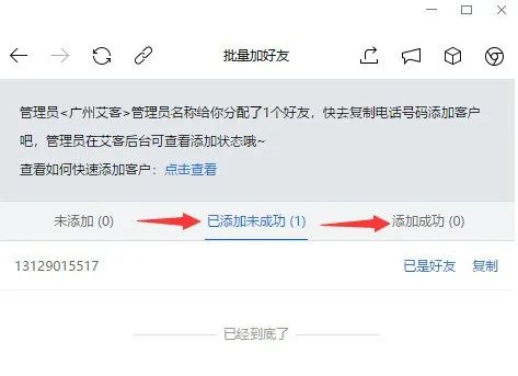 已复制的手机号会进入【已添加未成功】状态,即等待好友通过状态。好友通过后会自动变为【添加成功】。员工可以通过此消息弹窗了解自己添加客户的情况