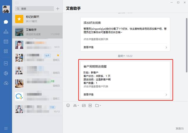 d、保存-创建任务,系统会通过 “耀世注册助手” 通知选中的员工,那个管理员给他们分配了客户资源。
