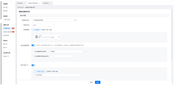 第二,在“无限群活码”页面设置群活码名称、分组、群聊、自动创建新群群、客户标签等内容,点击保存即可。