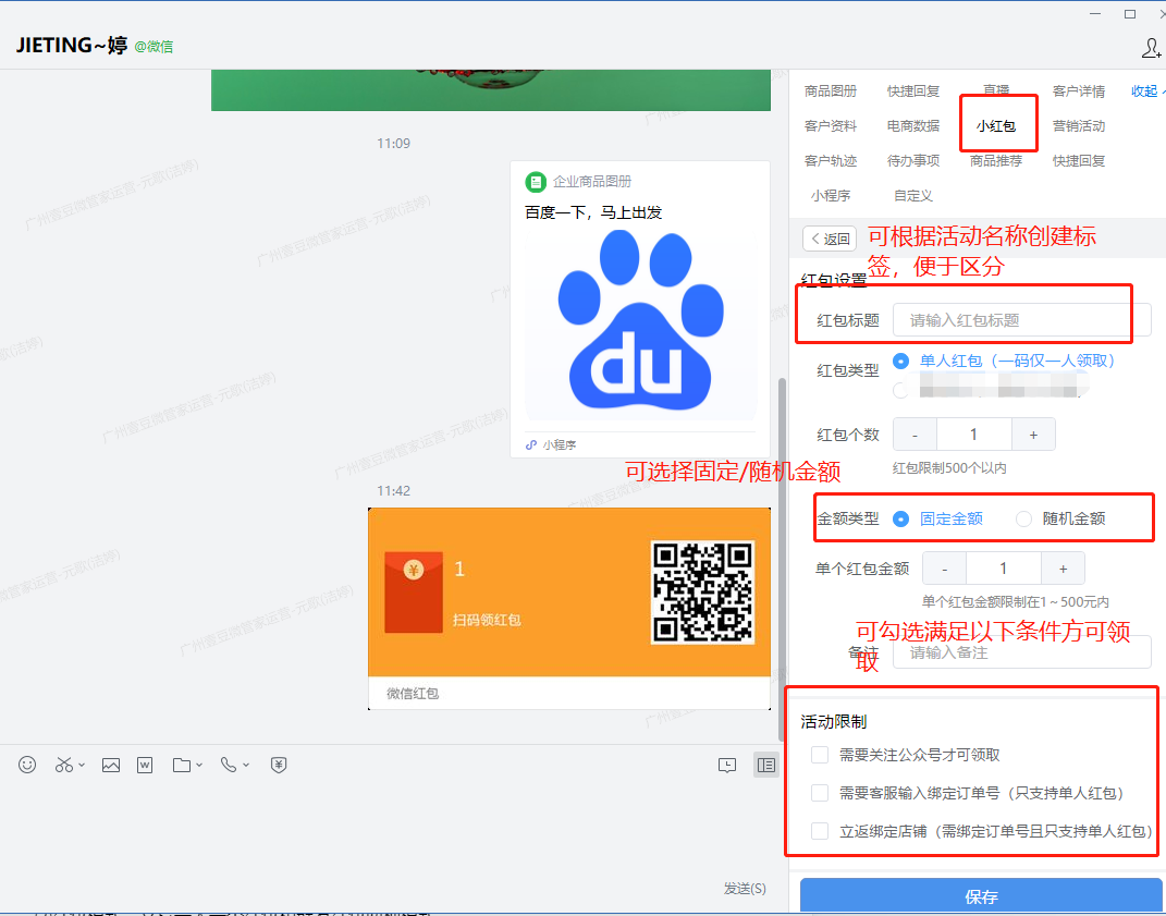 在红包设置中,企业可以设置红包标题、红包类型、红包个数、金额类型、单个红包金额限制、备注等信息。