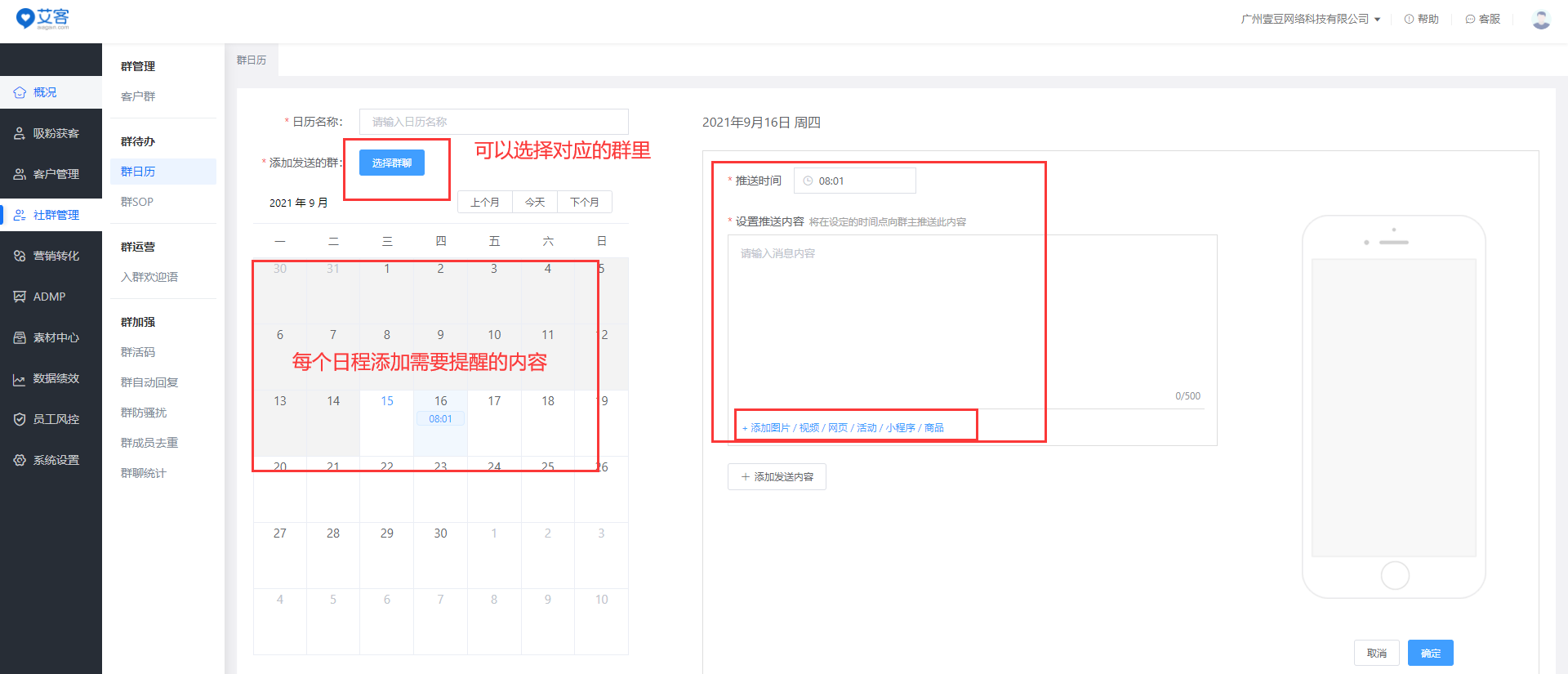 2、群日历功能:给对应的群添加日历任务,到达指定时间后系统通知群主去执行对应的任务。它的内容支持设置日历任务名称、发送的群聊可以选择多个,每个日程添加需要提醒的内容,推送时间精确到几点几分,推送内容跟SOP任务一样,支持图片、视频、网页、活动、小程序、商品等内容形式。