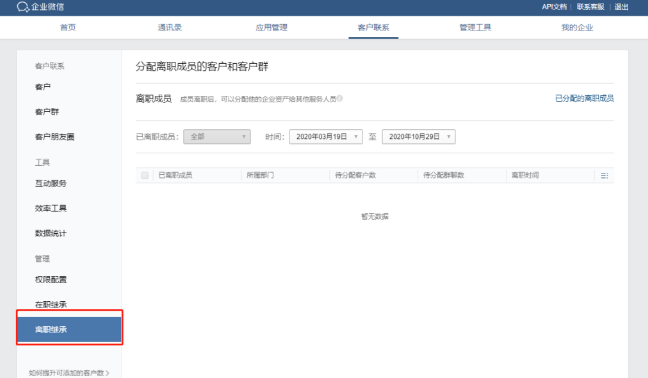 管理员只要登录企业微信后台,在【客户联系】—【离职继承】页面勾选离职员工,将离职员工管理的客户和客户群,分配给在职员工跟进。