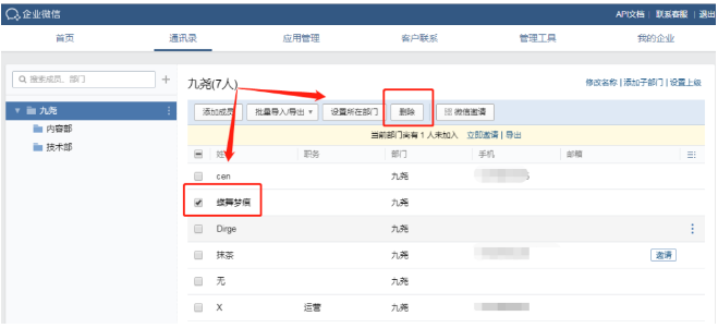 在进行离职继承后,离职员工就不能继续和之前的客户进行交流,这时候管理员就能登录企业微信后台,在通讯录页面搜索该离职员工,将员工的企业微信账号禁用或者删除,这样的话,离职员工就没有再登录使用本企业的企业微信权限了。